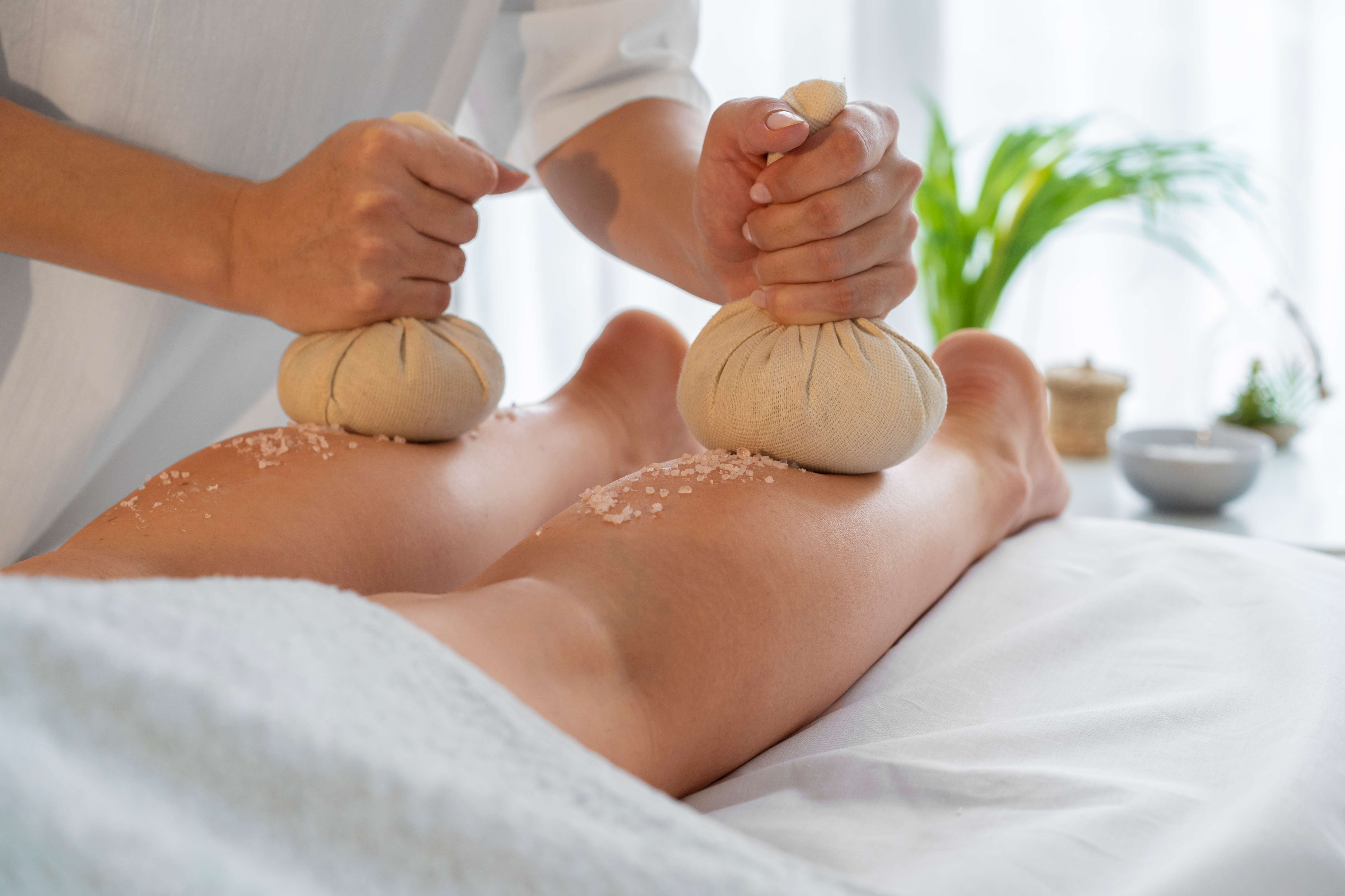 A therapeutic herbal pouch massage using warm bundles to relieve pain, stiffness, and detoxify the body naturally.